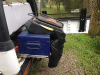 Im folgenden sieht man, das sich das Gewebe weit nach unten ausbeult. Das weiße dass man sieht, ist das Schaumstoffteil, das ich spontan unter geschoben habe. An der Stelle ist auch das Gewebe gerissen.Die blaue Box ist meine Box für Werkzeug, Ersatzteile, Bergung, etc. Sie ist recht und links an Vollauszüge angeschraubt. Jeder von denen trägt etwas mehr als 100kg. Ein hervorragender Arbeitsplatz