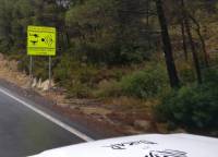 Dieses Schild muss mir jemand erklären. Man sieht einen Motorradfahrer, eine Andeutung wie bei den Geschwindigkeitskontrollen, einen Helicopter und eine Drone.