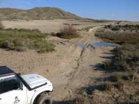 Einige Wege waren heute sehr lehmig. Das klebte an den Reifen, manchmal bin ich geschlittert. Auf den Reifen war etwa eine 2cm dicke Schicht aus Lehm. Der geht erst weg, wenn die Räder mal schnell drehen, oder wenn ich wieder längere Strecken auf Schotterwegen unterwegs bin. Dennoch, hing der Schlamm schwer am Auto. Am Unterboden, in den Radküsten, an den Trittbrettern. Hier ein Zwischenstopp am See, der Künstlich aufgestaut wird.