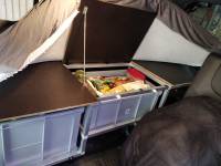Ich fing an, mir aus einem Alu Stecksystem das Bett zu bauen. Oben, die Liegefläche, darunter sollten 3x Euroboxen hineine passen. Die Boxen sind im Groben für folgendes gedacht: