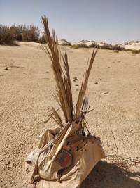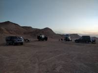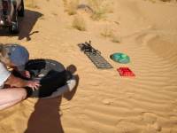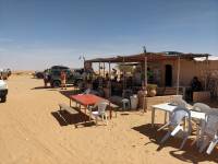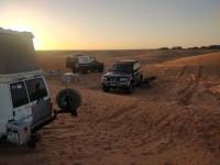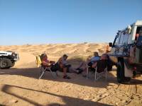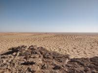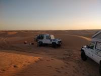 Nachdem wir noch etwas dem Treiben von Motorradtouristen zuschauten, wie sie sich mal mehr mal weniger trauten die Sanddünen hoch und runter zu fahren, machten wir uns nochmals auf den Weg, um einen Schlafplatz zu finden. Wir fuhren zum nahe gelegenen „Kamelfelsen“. Von dort ein paar Meter weg und stellten uns am Füße einer Erdwand in ein Chott. Sehr monoton, doch wir benötigten es nur für die Übernachtung.