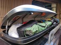 Auf dem Dach ist eine Dachbox hinzu gekommen. Sie bietet mir mehr Stauraum, hauptsächlich für sperrige aber leichte Dinge. Darin sind: