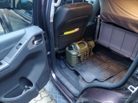 Der Kanister ist mit Metalschinen an den originalen Befestigungspunkten der Sitze fest gemacht. So sollte er zumindes beim Alltagsbetrieb nicht im Auto umher wandern können.