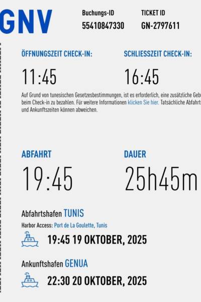 Die Ordnung und Organisation der GNV ist besser, als bei der CTN, was ich von meiner letzten Reise kenne. Die Kabinen sehen schöner aus. Das Restaurant ist teurer, aber bietet mehr Vielfalt. Der Fahrplan wurde gut eingehalten. Beim einladen der Autos, gab es ein Ticken mehr Ordnung.