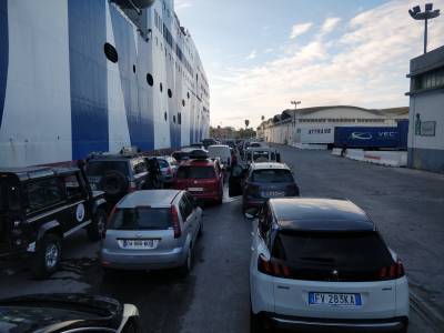 Es sind natürlich zwei Schlangen. Zuerst muss man zur Fährgesellschaft GNV. Dort zeigt man das Ticket und bekommt einen Stempel. Dann geht es zum Zoll. Hier bekommt man den nächsten Stempel. Die Zoll Schlange geht deutlich länger gesammt haben wir ungefähr 2h benötigt.